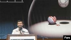 Iranian President Ahmadinejad addressing an anti-Zionism conference in Tehran in October 2005 (Fars) 8 February 2006 -- The United States has condemned an Iranian newspaper's plan to hold a contest for cartoons about the World War II Holocaust of Jews.