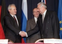 Slobodan Milosevic (left) shakes hands with Croatian President Franjo Tudjman after the signing of the Dayton peace accord in Paris on 21 November 1995 (epa)