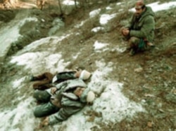 A Kosovo Liberation Army soldier beside the bodies of two elderly ethnic Albanians killed near Racak in 1999 (epa)