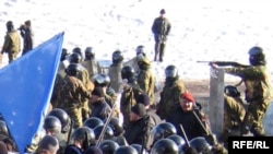 Riot police blocked the road leading to Akrestsyna, and beat their shields with truncheons while they advanced on the crowd.