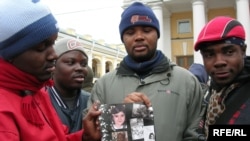 African students hold pictures of foreigners killed in St. Petersburg, including Lamzar Samba and a nine-year-old Tajik girl, Khursheda Sultanova (RFE/RL) ST. PETERSBURG, April 11, 2006 (RFE/RL) -- Some 1,000 protesters took to the street today to denounce a wave of racist attacks in Saint Petersburg.
