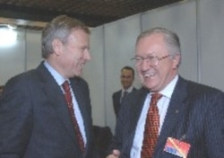 NATO Secretary-General Jaap de Hoop Scheffer (left) talking with Foreign Minister Tarasyuk in Brussels in April (courtesy photo)