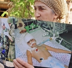 A woman holds a picture of her son, who was injured during the Beslan hostage taking, while she listens on May 16 to the verdict in the only Beslan-related trial to be held (TASS)