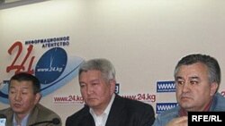 Opposition leaders Melis Eshimkanov (left to right), Feliks Kulov, and Omurbek Tekebaev at a press conference in Bishkek on April 19 (RFE/RL) BISHKEK, April 21, 2007 (RFE/RL) -- Kyrgyz opposition leader and former Prime Minister Feliks Kulov was questioned by  National Security Committee officials today over the April 19 disorder in the Kyrgyz capital, RFE/RL's Kyrgyz Service reported.