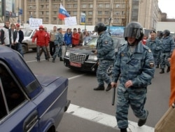 Orthodox believers and nationalists heckling a gay-rights rally in Moscow in May 2006 (RFE/RL)