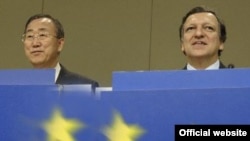 Ban (left) with Barroso (file photo) (official site) BRUSSELS, July 10, 2007 (RFE/RL) -- UN Secretary General Ban Ki-moon has expressed fears the EU's common stance on Kosovo could crumble if the status of the breakaway Serbian province is not resolved quickly. Although the EU officially supports a plan drawn up by UN envoy Martti Ahtisaari to give Kosovo internationally supervised independence, which has been rejected by Serbia, a number of the bloc's member states are known to remain skeptical of it.