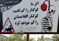 An antidrug billboard in Kabul shows a skeleton hanging from an opium bulb (AFP)