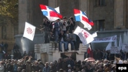 Four years later, it's Saakashvili who's at the center of public disenchantment. Tens of thousands of Georgians are estimated to have attended today's rally, organized by the National Council umbrella group, which counts democratic backsliding among its complaints about the country's leader. Some members go so far as to call for a "Georgia without a president," replacing the current system with a constitutional monarchy or a parliamentary republic.