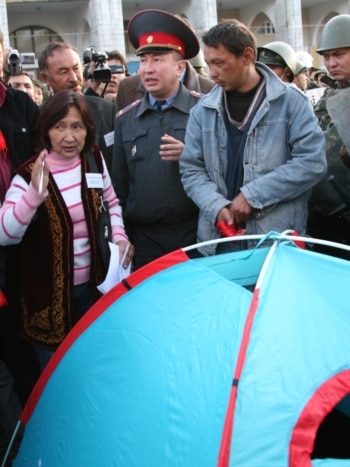 Aziza Abdyrasulova speaks with a police officer in Bishkek's central Alatoo Square in 2006 during antigovernment demonstrations. Her husband, Januzak, stands behind her. Eventually, the protesters were forcibly dispersed by police.