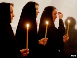 Nuns pray for Patriarch Aleksy II at Christ the Savior Cathedral in Moscow.