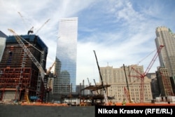 View from the south at the WTC development site. The glass building in the middle is the first finished structure of the new complex -- Four World Trade Center.