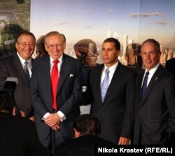 The major players in the WTC redevelopment plan: Port Authority Chairman Anthony Coscia (left), the developer Larry Silverstein, New York State Governor David Paterson, and New York City Mayor Michael Bloomberg