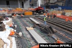Construction workers prepare the iron grid for the concrete foundation of Six World Trade Center.