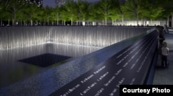 An aerial view of the 9/11 memorial with the two reflecting pools and waterfalls at the footprints of the original Twin Towers. The complex is scheduled to be finished by 2018.