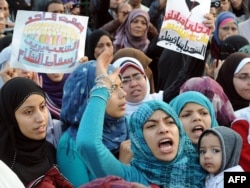 Women protesters hold up signs reading: "With one voice, the nation wants the regime out" at a demonstration in Cairo.