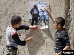 Boys paste a poster of national hero Ahmad Shah Masud on a wall in Panjshir Province earlier this month.