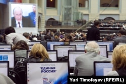 Journalists in the press center watch a live broadcast of Prime Minister Vladimir Putin's speech at the same United Russia party congress in Moscow on September 23.