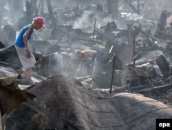 People check the ruins of private storage buildings and garages that were destroyed in the village of Ostfievo on August 3.