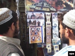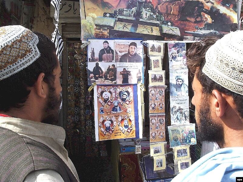 Afghan men look at posters of Al-Qaeda and Taliban fighters at a poster shop in Spin Boldak