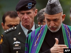 General Stanley McChrystal (left) and Afghan President Hamid Karzai visit Arlington National Cemetery in Virginia on May 13.