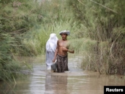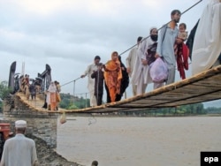 A woman in the northwest region who has been trapped by the flooding told RFE/RL's Radio Mashaal, "We have been stranded here for the past 10 days. There is no food, nothing. Whatever food was available is gone now. We have eight children with us. There is nothing left [even] for the children, and the medicine that was here has also been used up."