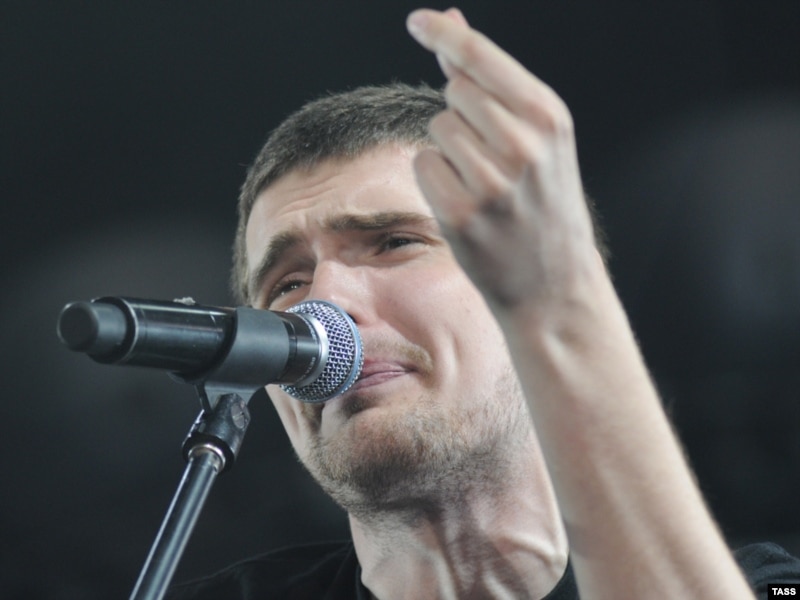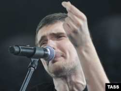 Russian rocker Yuri Shevchuk performs at a protest rally in Moscow on August 22.