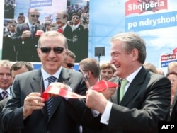 Albanian Prime Minister Sali Berisha (right) and his Turkish counterpart Recep Tayyip Erdogan cut the ribbon during the inauguration of a highway connecting Albania and Kosovo last year.