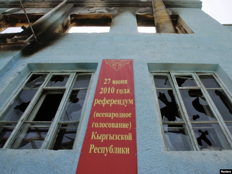 A banner that reads "June 27, 2010. Referendum (nationwide voting) of Kyrgyz Republic" hangs on the wall of a ruined local school in Osh.