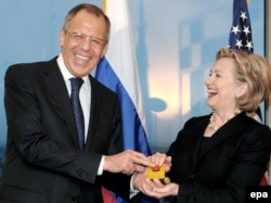 U.S. Secretary of State Hillary Clinton (right) gives a gift of a symbolic "reset" button to her Russian counterpart, Sergei Lavrov.