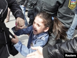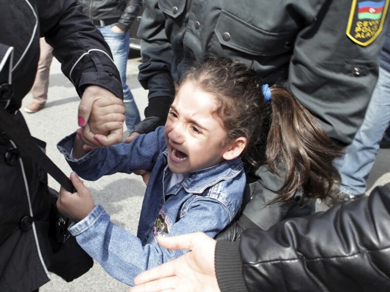 In a video taken by RFE/RL's Azerbaijani Service during an antigovernment rally in Baku on April 17, a pigtailed little girl dressed in a jean jacket can be seen shaking her fist and chanting "Freedom" and "Resignation" as at least three security agents close in on her and her mother and lead them away.