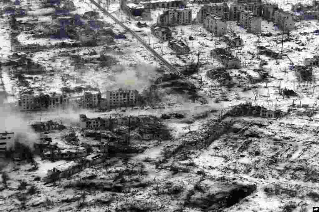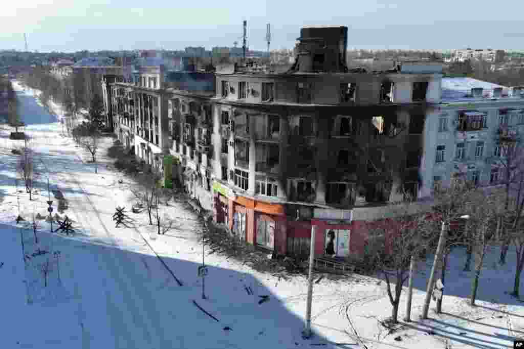 Drone footage captured on February 13 shows Bakhmut, another devastated city in eastern Ukraine. It has been the scene of some of the bloodiest fighting of the war.