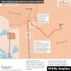 Those exchanges clashed with remarks by Belarusian authorities on May 24 -- after the incident but before the transcript's release emphasizing the purported role of the Ryanair crew.