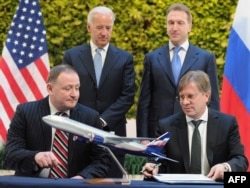 Biden (top left) and Russian First Deputy Prime Minister Igor Shuvalov (top right) look at Sergei Kravchenko (left), director of Boeing Russia, and the CEO of Aeroflot Vitaly Saveliev (right) as they sign the contract.