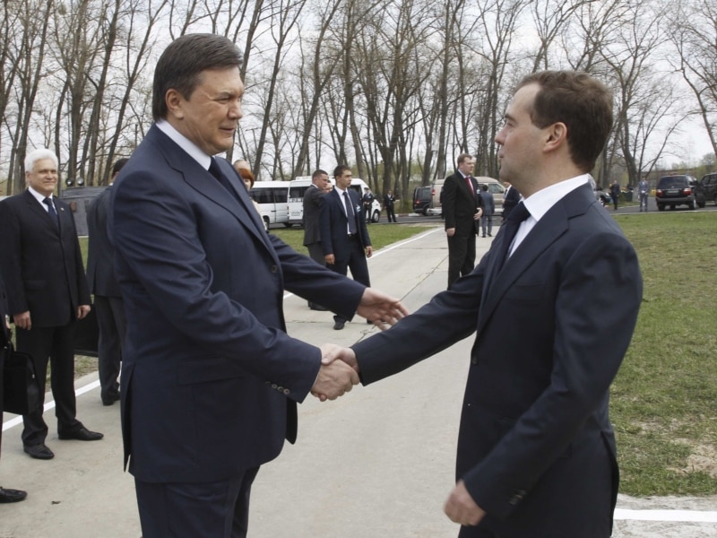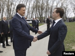Russian President Dmitry Medvedev (right) shakes hands with Ukrainian President Viktor Yanukovych at the memorial events in Chornobyl.