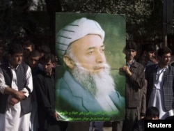 Supporters of Burhanuddin Rabbani hold a portrait of him as they stand outside his house on September 21, one day after he was killed in Kabul.
