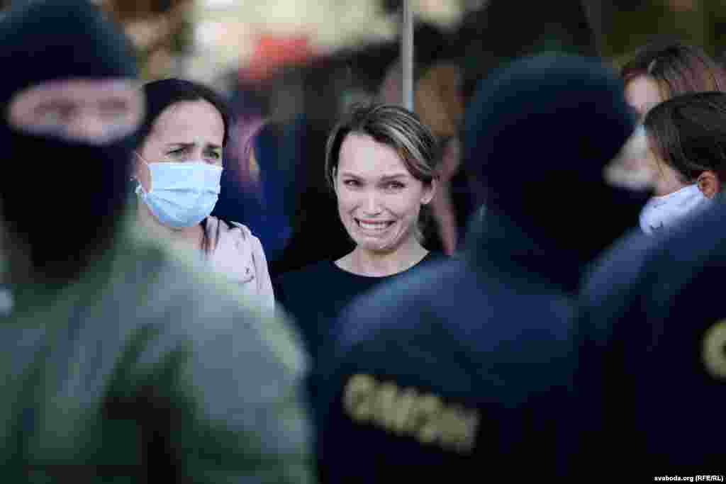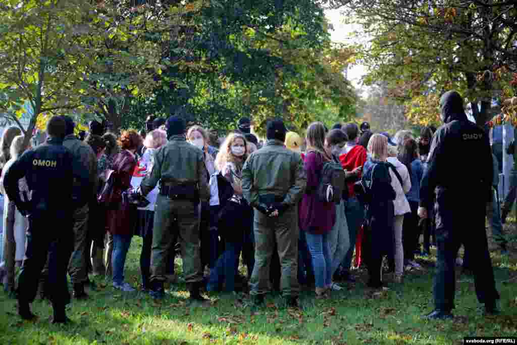 Hundreds of protesters, many of them women, marched in central Minsk on September 19, briefly scuffling with riot police who then blocked their path.