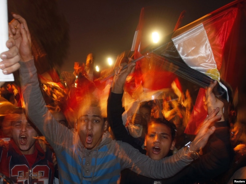 Protesters celebrate Mubarak's resignation on Tahrir Square on February 11.