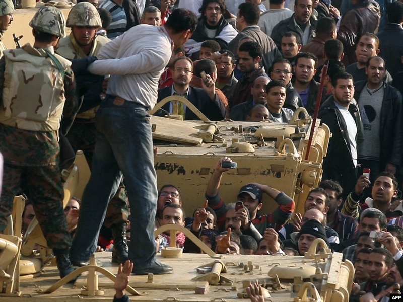 The army used tanks and infantry to create an 80-meter-wide buffer zone in the square in an attempt to separate an estimated 10,000 government supporters from supporters of the regime, who have fought running battles since February 2 in and around the square.