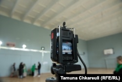 It doesn't feel safe here working alone, so I join Mindia Gabadze, a TV journalist, and go to another polling station at a school. We are met by a group of men dressed in black, and when we start filming, they leave the area, cursing as they go.