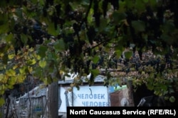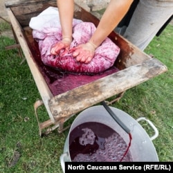 Red grapes being pressed for their juices. Wine is an important part of both Ossetian and Georgian cultures. So too is churchkhela, a traditional candy made from grapes and walnuts.