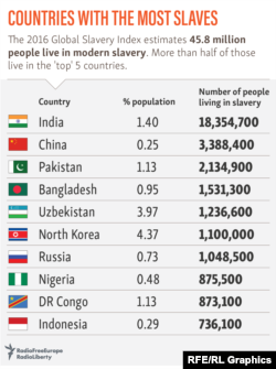 In absolute terms, the report said countries with the most people forced into slavery are India, China, Pakistan, Bangladesh, and Uzbekistan.