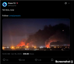 A week later, the same TV station went even further, using muted footage of an Israeli attack on Iran -- filmed near Chitgar Lake in Tehran and posted online on June 16 -- while talking about Iran attacking Israel with long-range and heavy missiles.