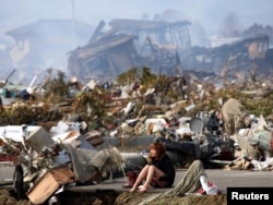 A woman cries while sitting on a road amid the destroyed city of Natori, Miyagi Prefecture, on March 13.