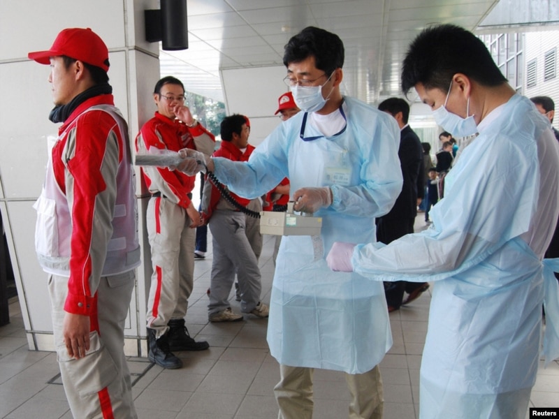 Technicians scan Red Cross rescue workers for signs of radiation in Nagahama City, Shiga Prefecture, on March 14.