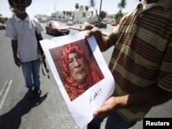 A rebel fighter shows a manipulated photograph of Muammar Qaddafi at a checkpoint in Tripoli on August 29.