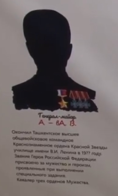 In place of a photograph, the biography shows only a black silhouette. It states that the person is a recipient of the Hero of Russia award. Wording on the board suggests that it honors alumni who are no longer living.