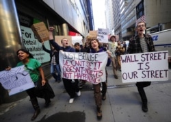 In Chicago, demonstrators pounded drums in the city's financial district. In Boston, they marched to the statehouse with signs that read, "Fight the rich, not their wars" and "Human need, not corporate greed." In St. Louis, Kansas City, and Los Angeles, demonstrators waved protest signs at passing cars.