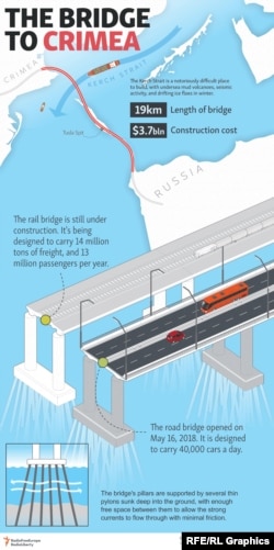 The 19-kilometer bridge over the Kerch Strait had been scheduled to open in December 2018, but Russian authorities recently announced it would open for cars and buses on May 16.