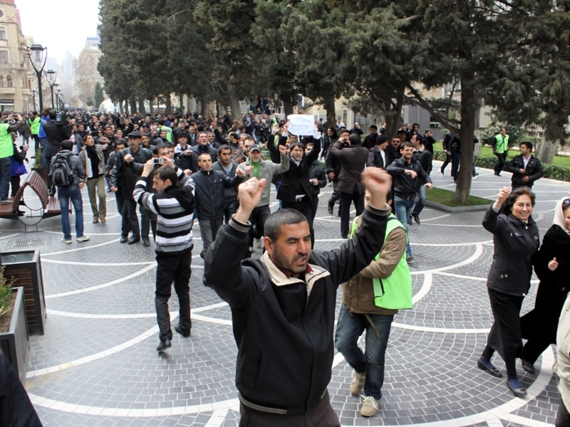 Protesters were holding placards reading "We want freedom," "Ilham, go away," and chanting for President Ilham Aliyev's "resignation" from office.
