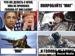 This narrative depicts U.S. President Barack Obama and German Chancellor Angela Merkel in distress, at a loss over what to do about IS. Putin, smiling at the helm of a fighter jet, suggests trying a MiG, which this meme claims is a great cure for headaches.